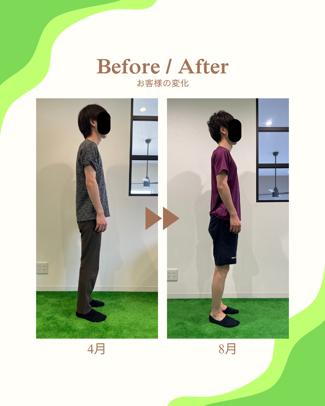 ・身体の変化:1か月程度で腰痛が改善し、反り腰・猫背が目立たないスッキリした姿勢に。
